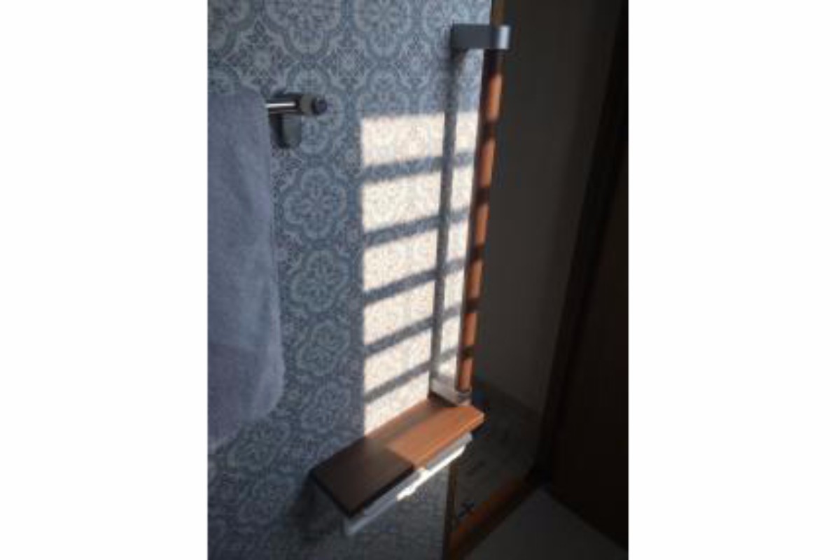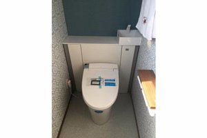 収納と手洗いを兼ねている背面キャビネットを取付。背中のクロスを一面変える事でおしゃれに仕上がりました。