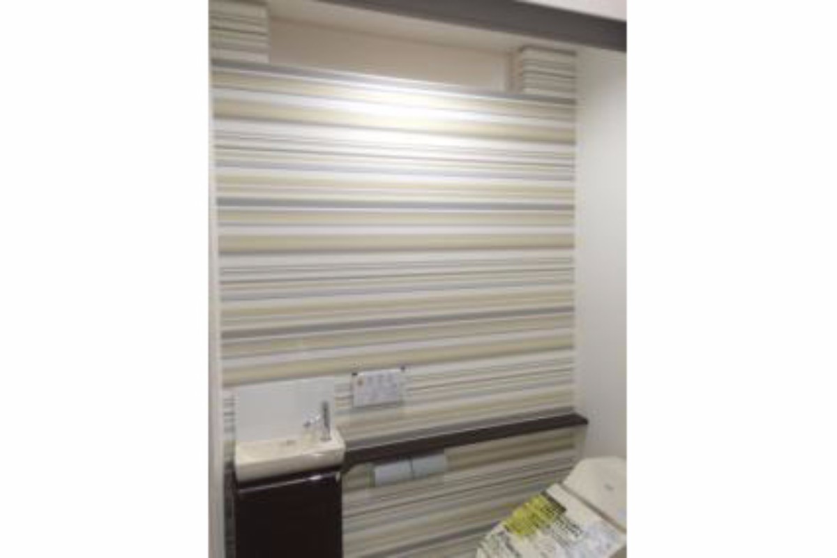 廊下との敷居のない吊戸を取付し、高級感あふれるトイレに仕上がりました。また、壁面上部に光取りを造作しました。まぶしいです!!