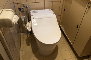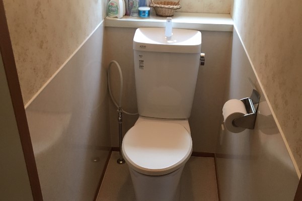 既存のトイレに便フタ開閉機能が付いていましたので、アラウーノVの便座をグレードアップし開閉機能・オート脱臭機能付きをご提案。タイルのトイレで給水配管から蛇口を取り出しして掃除の際にホースを接続し水洗いしているとのお話でしたので、蛇口を取り付けしたままトイレの入替えを行いました。トイレのサイズの関係で給水管を以前より高くして蛇口を取り付けする必要がありましたのでその形で施工したところ従来より操作がし易くなりお客様にも満足いただけました。