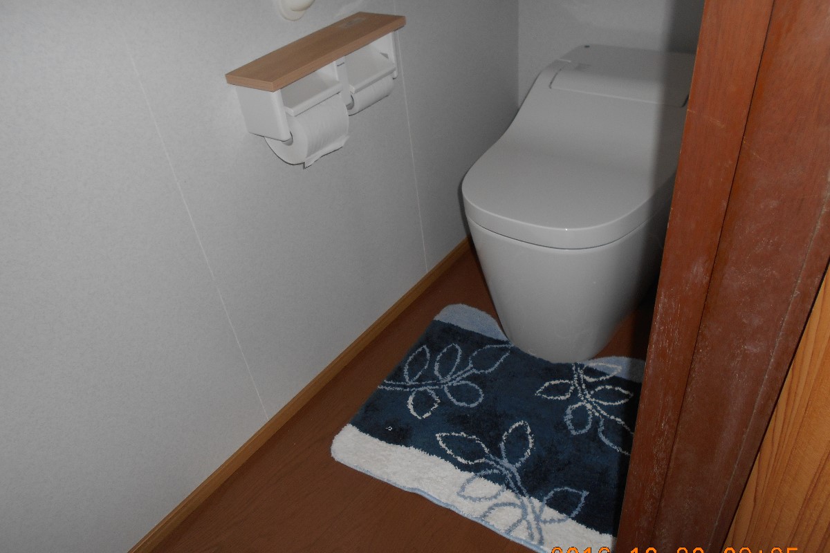 施主様の家族にお年寄りがおり和式のトイレが使いづらくなり全面的な改修を依頼されました。初回訪問時玄関からトイレまでの床の状態が悪い為、フロアの張り替えを同時にお勧めし全体的なバリアフリー化を行いました。